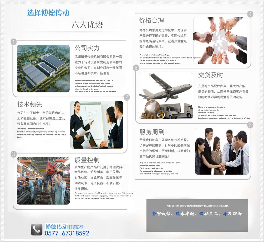 溫州博德傳動機械有限公司是一家致力于傳動設備研發制造和銷售的專業性公司。多年來公司十分重視技術進步工作,與全國相關行業的各大科研...